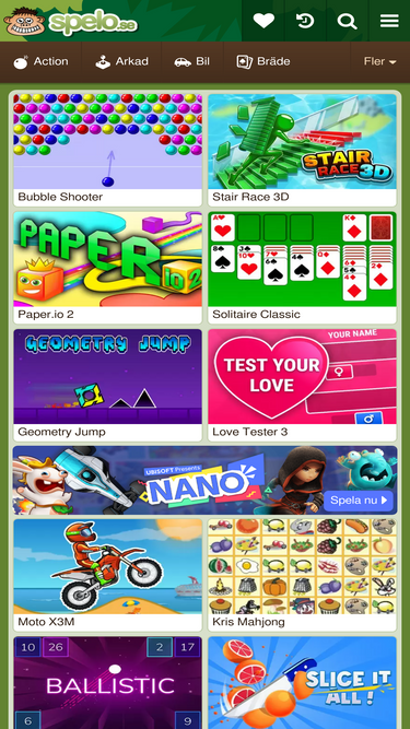 Spela ett brett urval onlinespel från populära 3-i-rad-spel till fantastiska Actionspel. Vi har samlat de allra bästa och roligaste gratisspelen som finns att tillgå där ute på internet. Våra spel går att spela över flera enheter så att du kan ta del av dem var du än befinner dig.